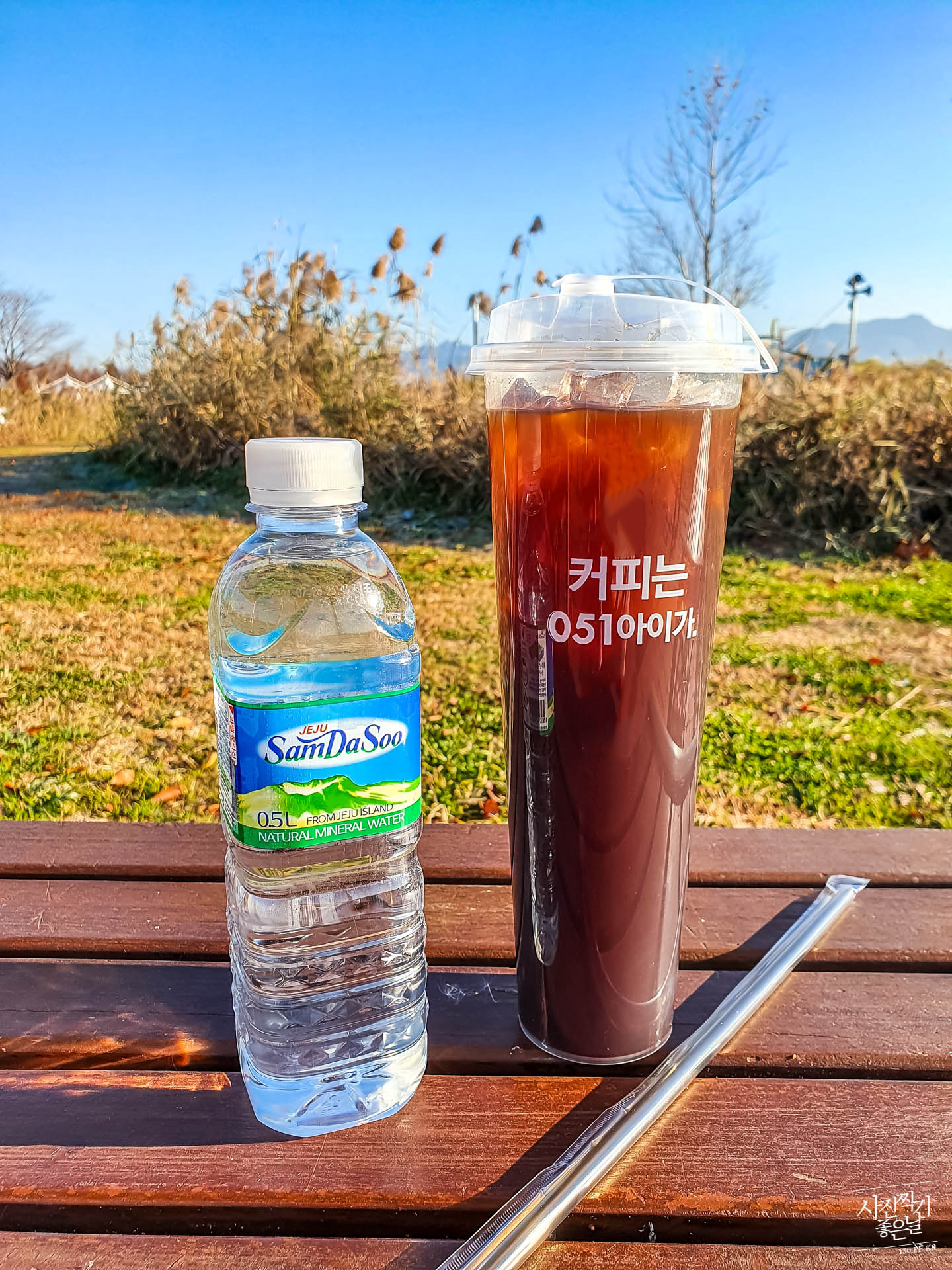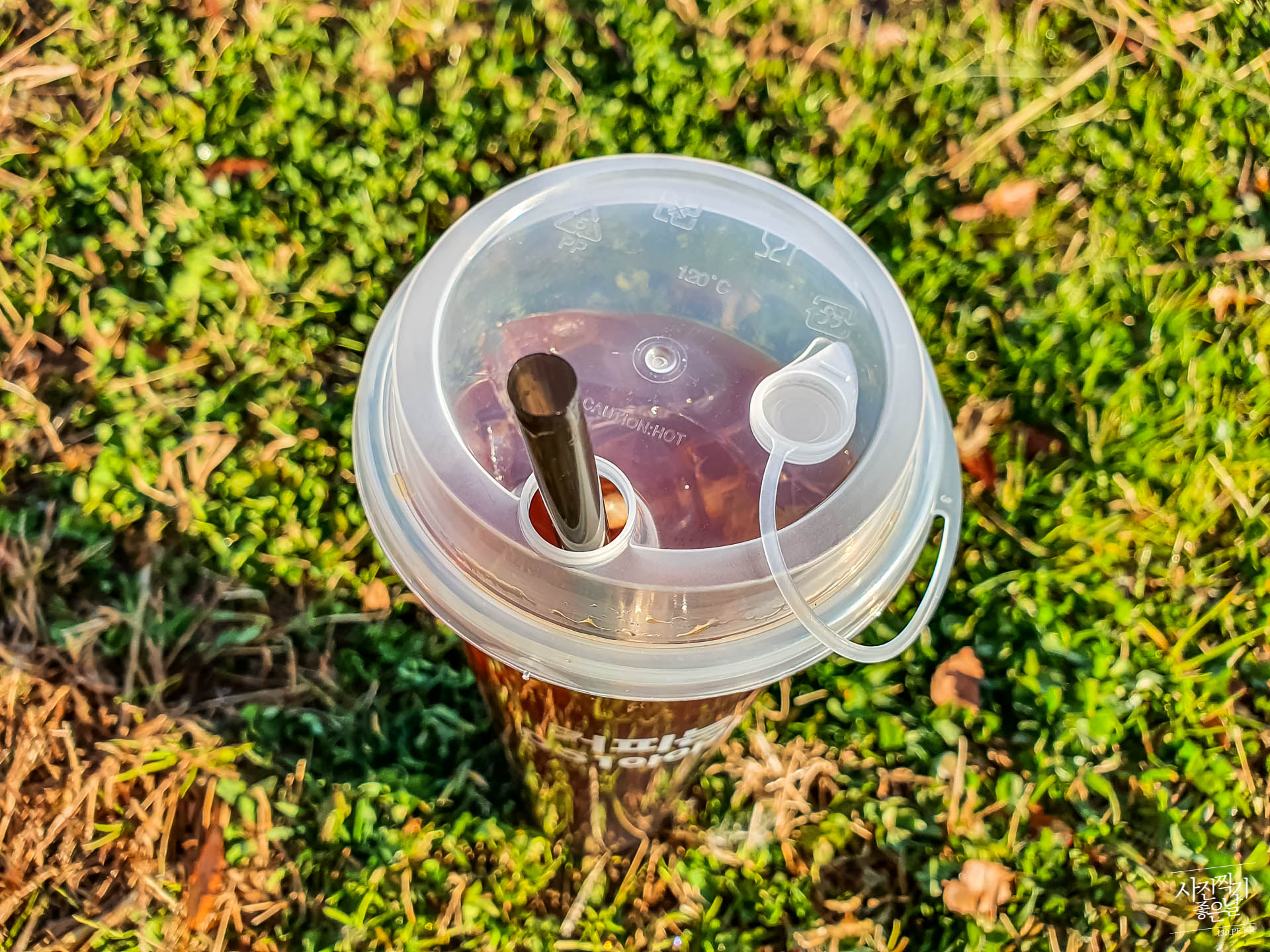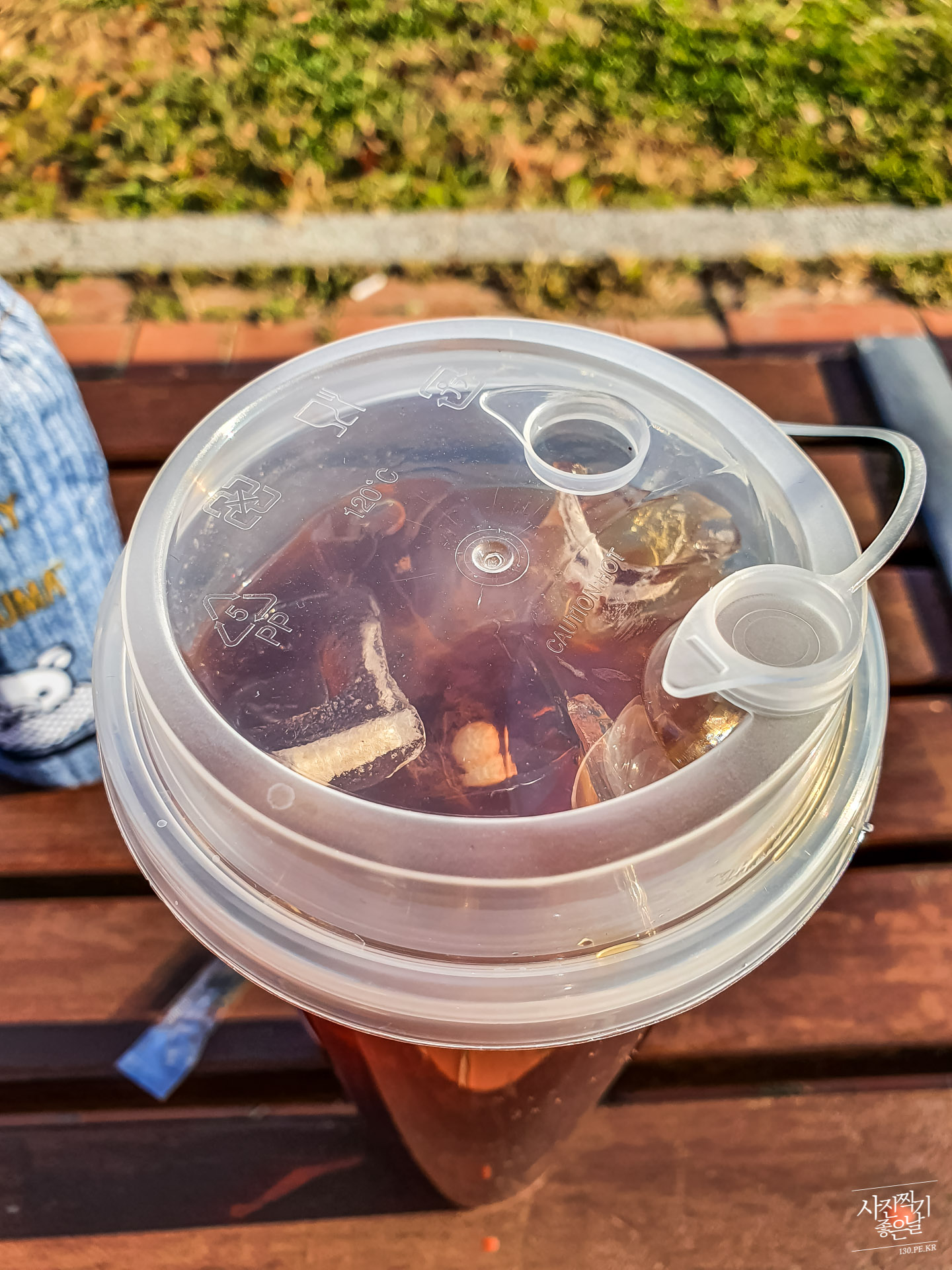 ๊ทธ๋ฆฌ๊ณ ์ ์ ๋ฒค์น์ ์์์ ์ปคํผ๋ฅผ ๋ง์ญ๋๋ค.
