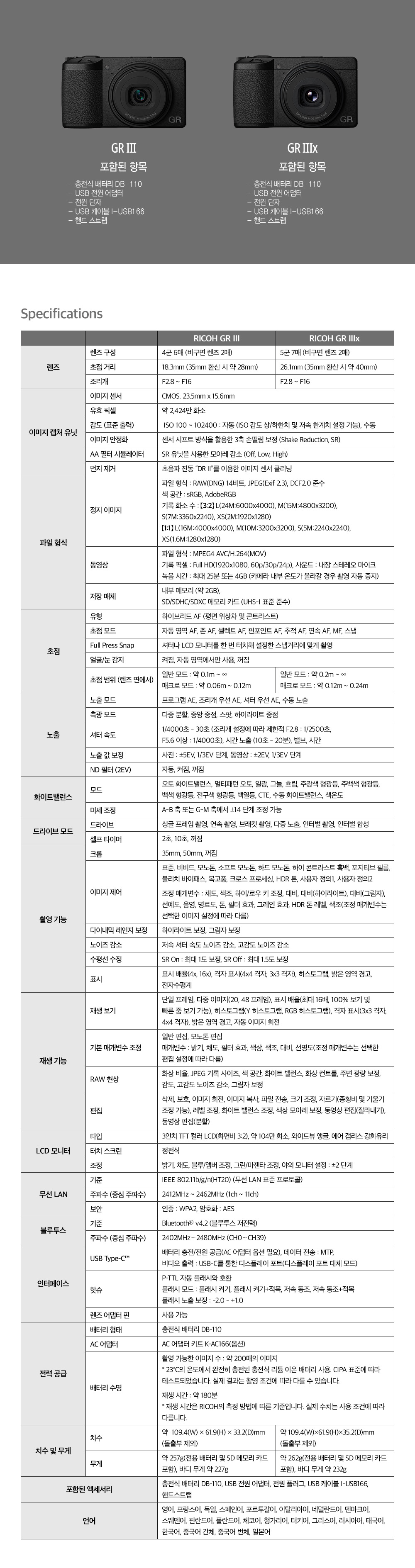 ์์ธํ ์คํ์ ์๋์ ๊ฐ์ต๋๋ค. GR3์ GR3x์ ์ฐจ์ด๋ ํ๊ฐ, ํ๊ฐ๋นผ๊ณ ๋ชจ๋ ์ฑ๋ฅ์ด ๋์ผํฉ๋๋ค.
